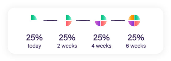 Your order will be shipped out right away* and your payments will be split up over 6 weeks.